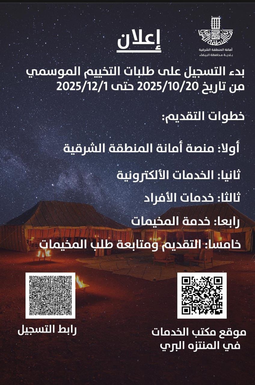 وكشفت أمانة المنطقة الشرقية عن جاهزية موقع المنتزه البري، والذي تم تخصيصه لإقامة المخيمات البرية في موسم الشتاء والربيع من كل عام، والبدء في تجهيز الموقع للعام الحالي والتنسيق مع الجهات ذات العلاقة لشمولية الخدمات داخل هذا المتنزه، حيث بدأ استقبال طلبات التسجيل من 20/10/ 2025م ويستمر حتى 1/12/2025م.