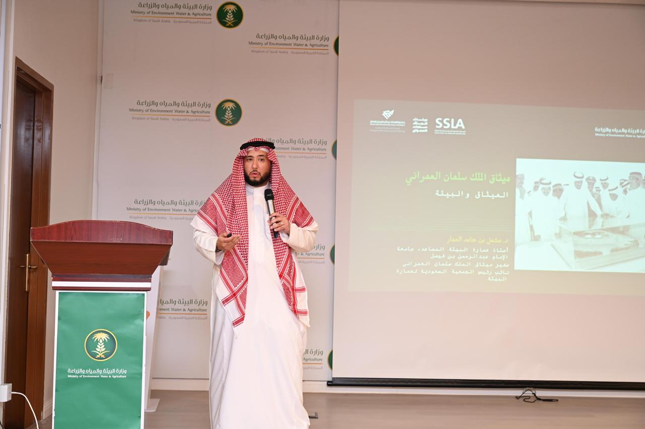 تلتها محاضرة بعنوان «ميثاق الملك سلمان العمراني والبيئي» ألقاها الدكتور مشعل العمار، أستاذ عمارة البيئة المساعد بكلية العمارة والتخطيط بجامعة الإمام عبدالرحمن بن فيصل، استعرض خلالها أبرز مضامين الميثاق وأهدافه في تحقيق التنمية العمرانية المتوازنة التي تراعي البعد البيئي والاستدامة.