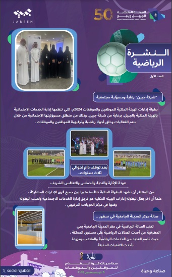 تنظم الهيئة الملكية بالجبيل ممثلة في ادارة الخدمات الاجتماعية بطولة سداسيات كرة القدم لموظفي وموظفات الهيئة الملكية بالجبيل على صالة المركز الرياضي بالمدينة الجامعية الجديدة بحي المطرفية برعاية من شركة الجبيل وينبع لخدمات المدن الصناعية “جبين” غداً الأحد الثامن من ديسمبر.