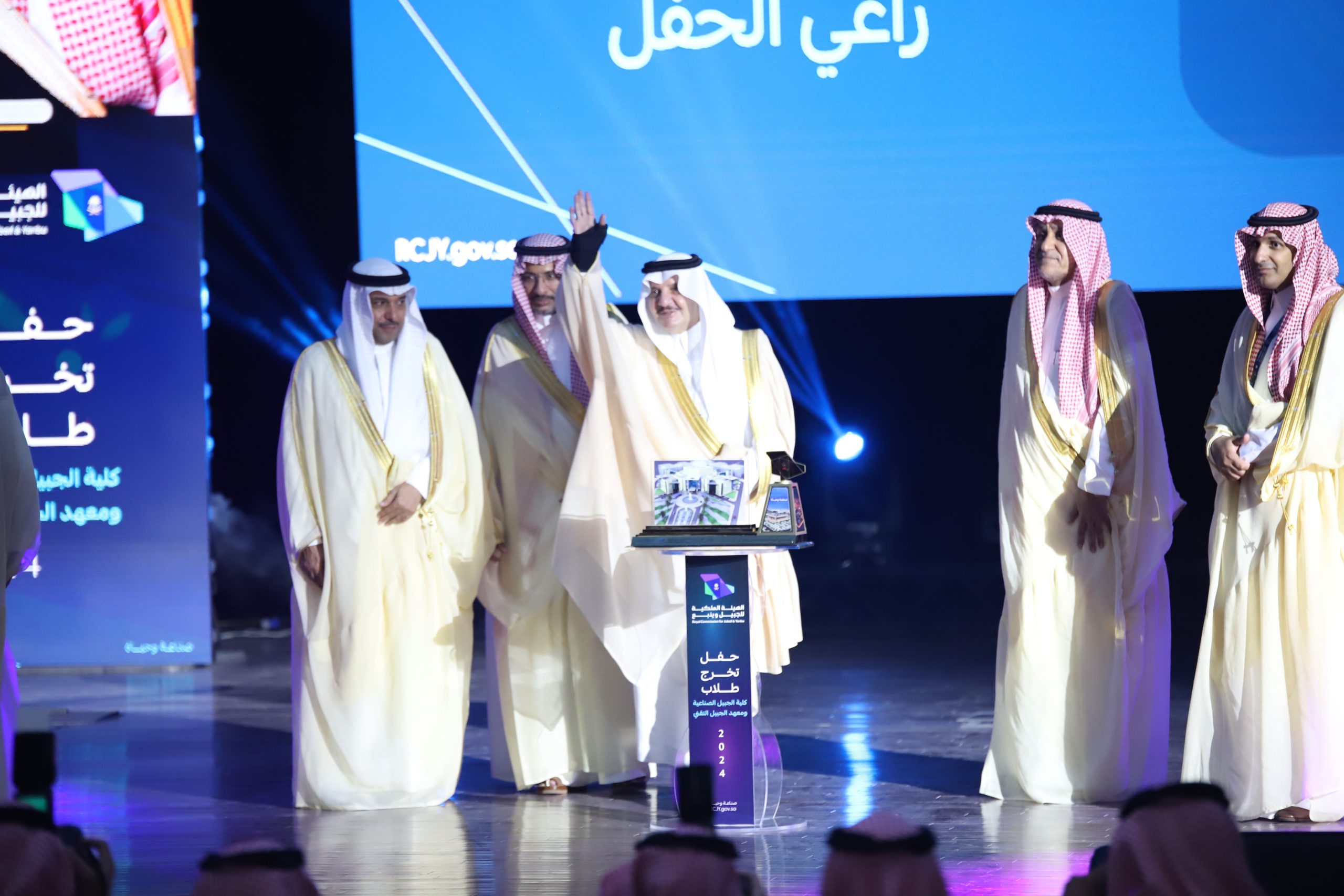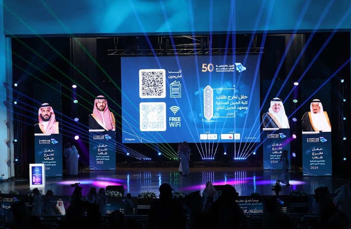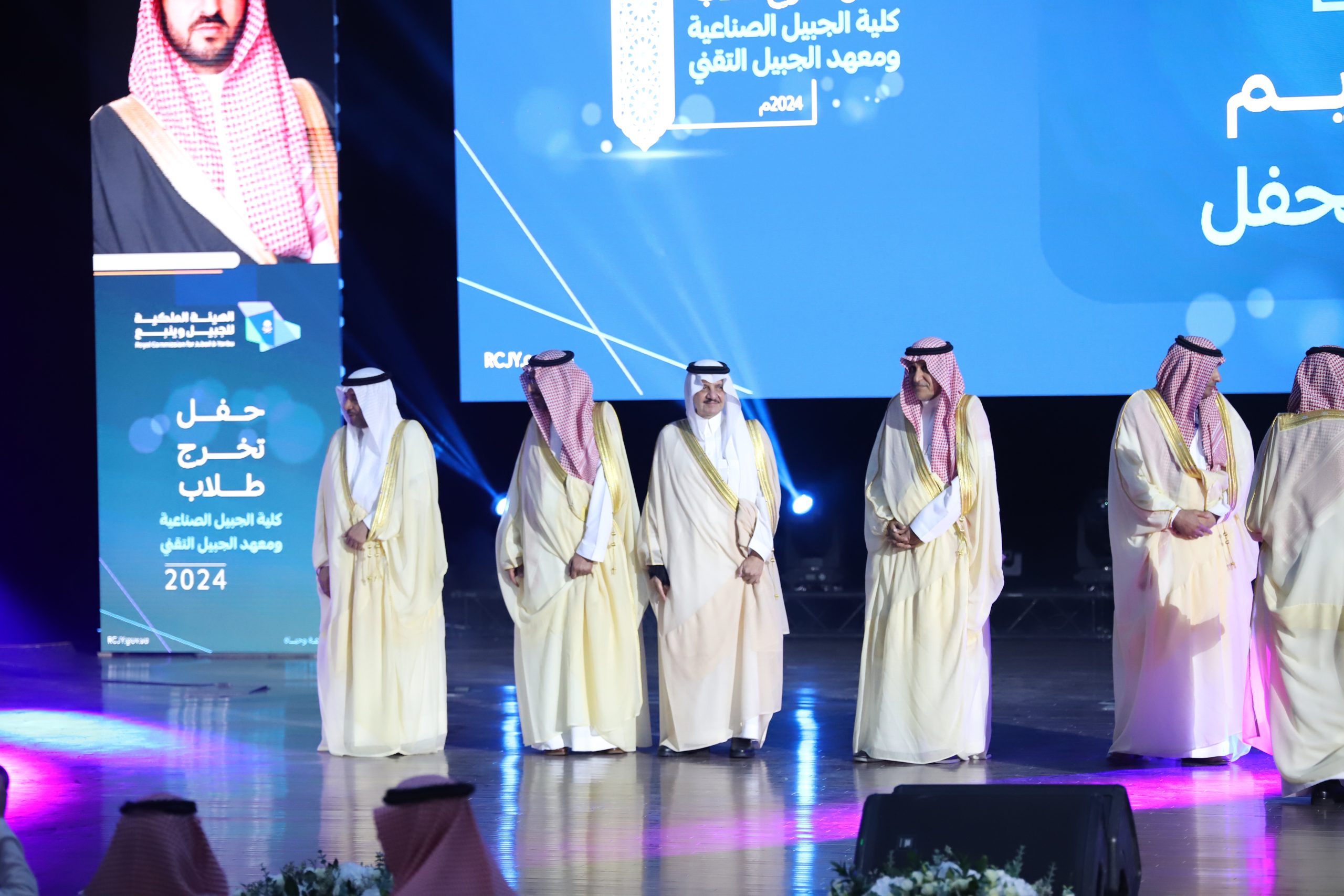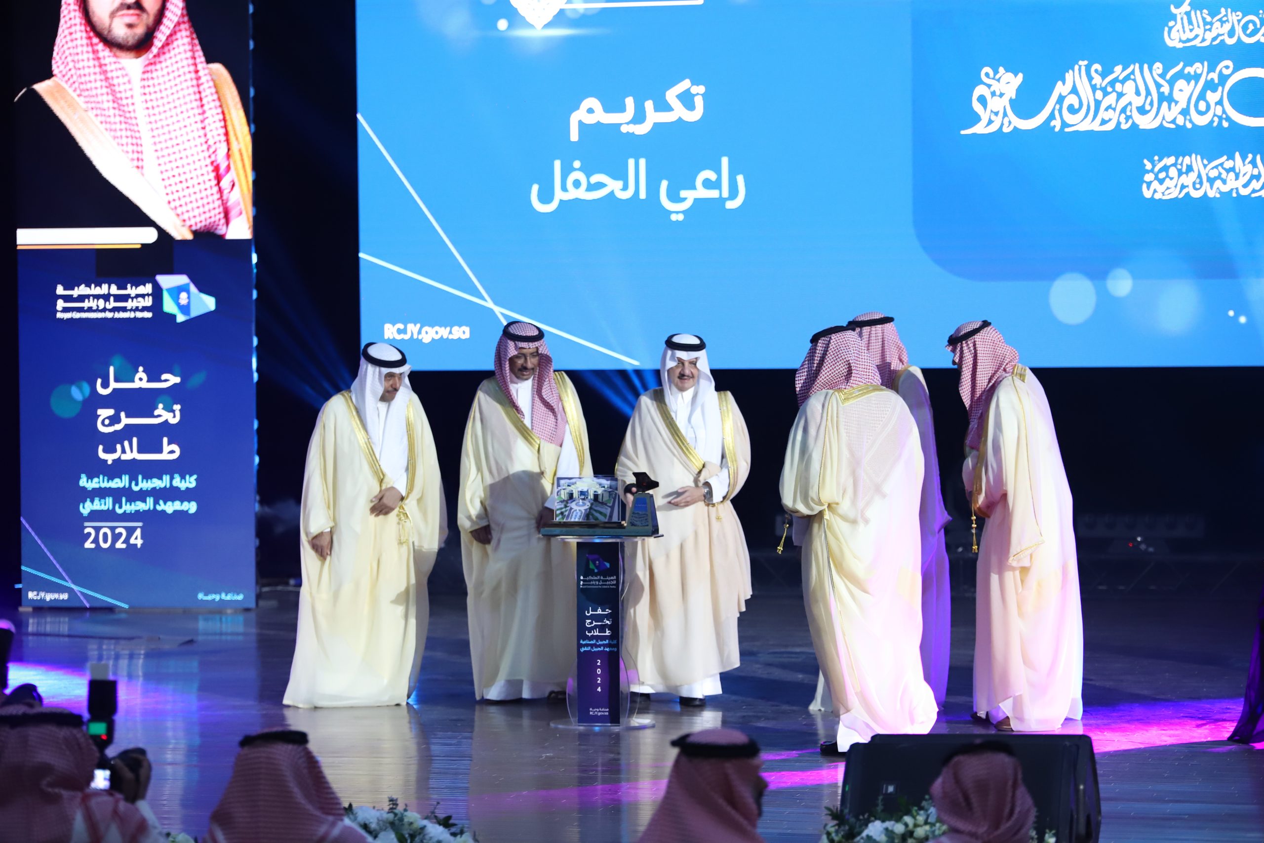ورعى صاحب السمو الملكي الأمير سعود بن نايف بن عبد العزيز أمير الشرقية مساء الأحد حفل تخرج طلاب كلية الجبيل الصناعية ومعهد الجبيل التقني 2024م والبالغ عددهم (2893) خريج بحضور معالي وزير الصناعة والثروة المعدنية رئيس مجلس إدارة الهيئة الملكية للجبيل وينبع الأستاذ بندر بن إبراهيم الخريف ومعالي رئيس الهيئة الملكية للجبيل وينبع المهندس خالد بن محمد السالم، بمسرح المدينة الجامعية بمدينة الجبيل الصناعية.