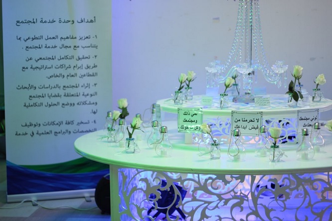 أقامت وحدة خدمة المجتمع التابعة لوكالة شؤون الطالبات بكلية التربية بالجبيل – جامعة الدمام يوم الأربعاء الموافق 1438/1/11هـ في جناح ( ج ) ركن تعريفي بأهداف وحدة خدمة المجتمع واستقبال مقترحات الطالبات لأفكار تخدم المجتمع وعرض الخدمات المجتمعية المقدمة من جامعة الدمام وكان الركن يحتوي على عرض لهذه الاهداف والخدمات المجتمعية وعرض لأفكار موجهه للمجتمع والتي سيتم دراستها من قبل الوحدة وتنفيذ الممكن منها بمشاركة الطالبات .