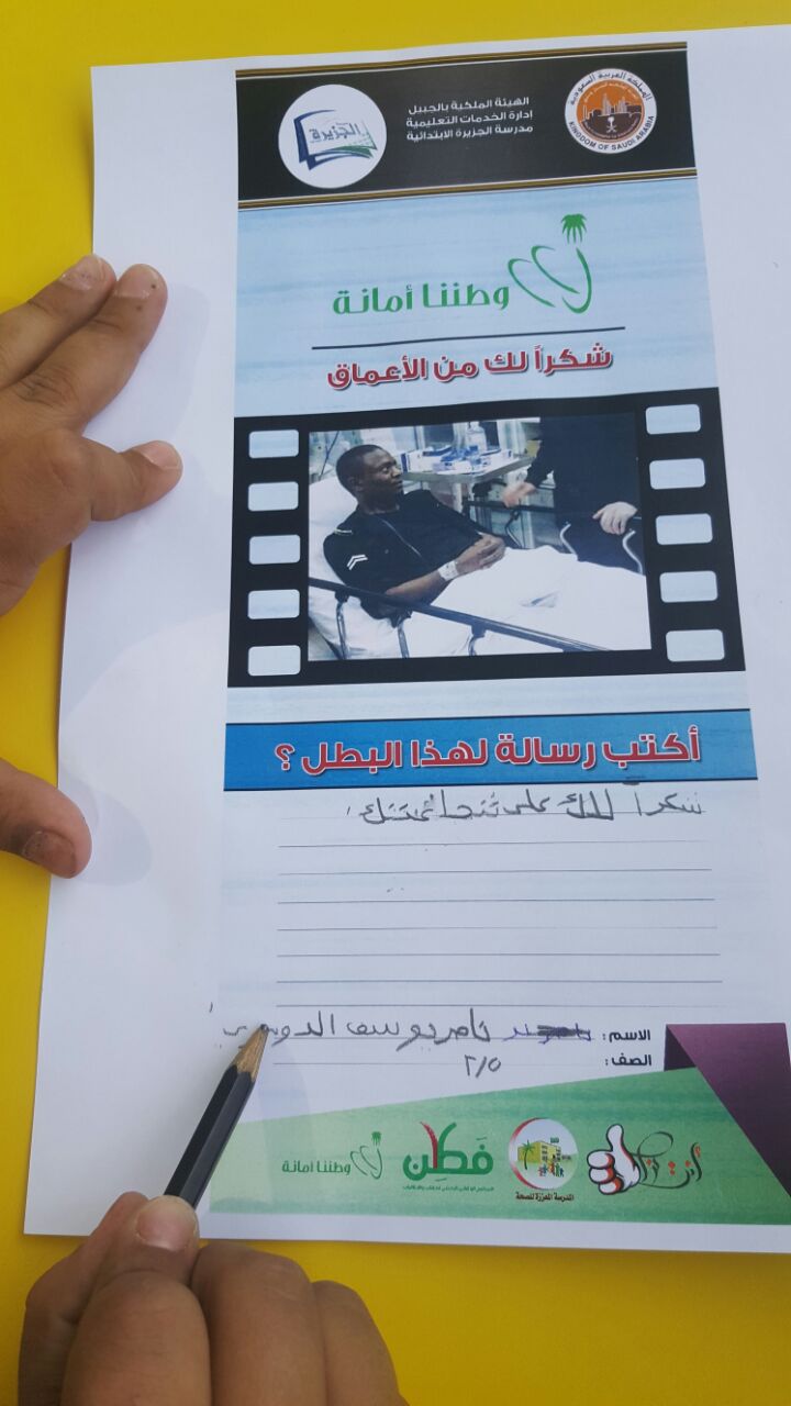 قامت مدرسة الجزيرة الابتدائية بالهيئة الملكية بالجبيل، بمبادرة رائعة في تجسيد قوة التلاحم بين المواطن ورجل الأمن، حيث ترجم طلاب المدرسة مشاعرهم تجاه رجل الأمن / جبران عواجي ، ضمن فعالية أقامها نادي العطاء والتطوع لطلاب المدرسة بكتابة رسالة شكر وامتنان لهذا البطل، شارك فيها حوالي 50 طالباً من مختلف المراحل الدراسية والتي حملت في طياتها صدق المشاعر والفخر ببطل الوطن جبران عواجي.