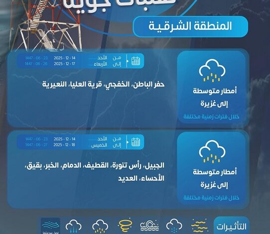 أمطار متوسطة إلى غزيرة على مدينة الدمام وعدد من محافظات المنطقة الشرقية ابتداءً من يوم غدٍ الأحد