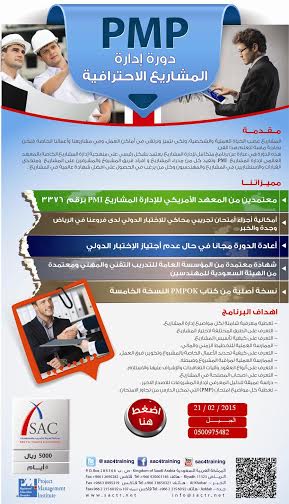 برنامج إدارة المشاريع PMP في الجبيل 21/2/2015م بفندق جولدن تاليب كورنيش الجبيل للتعرف أكثر عن طريقتنا في تدريب الدورة www.youtube.com/watch?v=y__Spc-B5Eo لتعرف أكثر عن SAC https://www.youtube.com/watch?v=RP6q92Pevu4 PMP للتسجيل http://sactr.net/nsac/course.php?cid=32