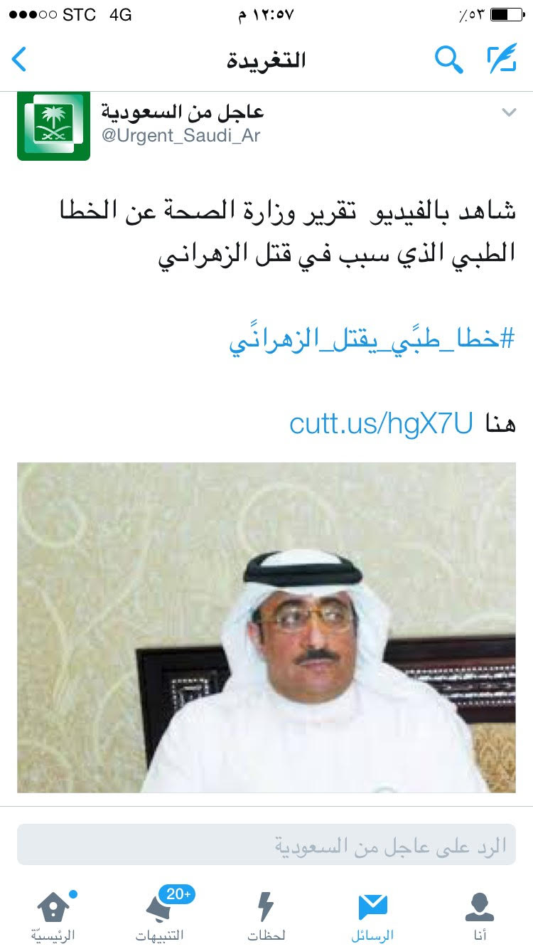 نشرت احدى حسابات الاخبار العاجلة بتويتر صورة للزميل الإعلامي مدير مكتب جريدة اليوم بالجبيل عطية الزهراني على أنه المتوفى باسم عطيه الزهراني بسبب خطأ طبي وذلك تحت وسم “