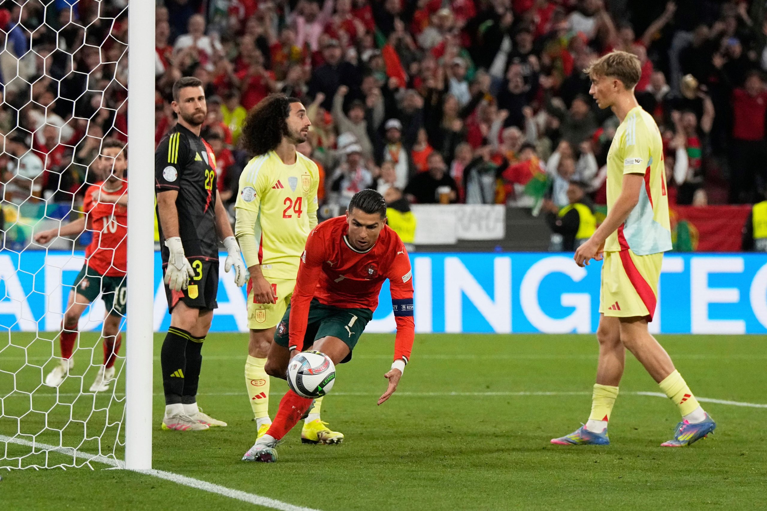 توّجت البرتغال، مساء الأحد، بلقب دوري الأمم الأوروبية لكرة القدم، بعد فوزها على إسبانيا بالمباراة النهائية بركلات الترجيح بنتيجة (5 / 3)، التي لجأ إليها المنتخبان عقب تعادلهما (2 / 2) في الوقتين الأصلي والإضافي للقاء.
