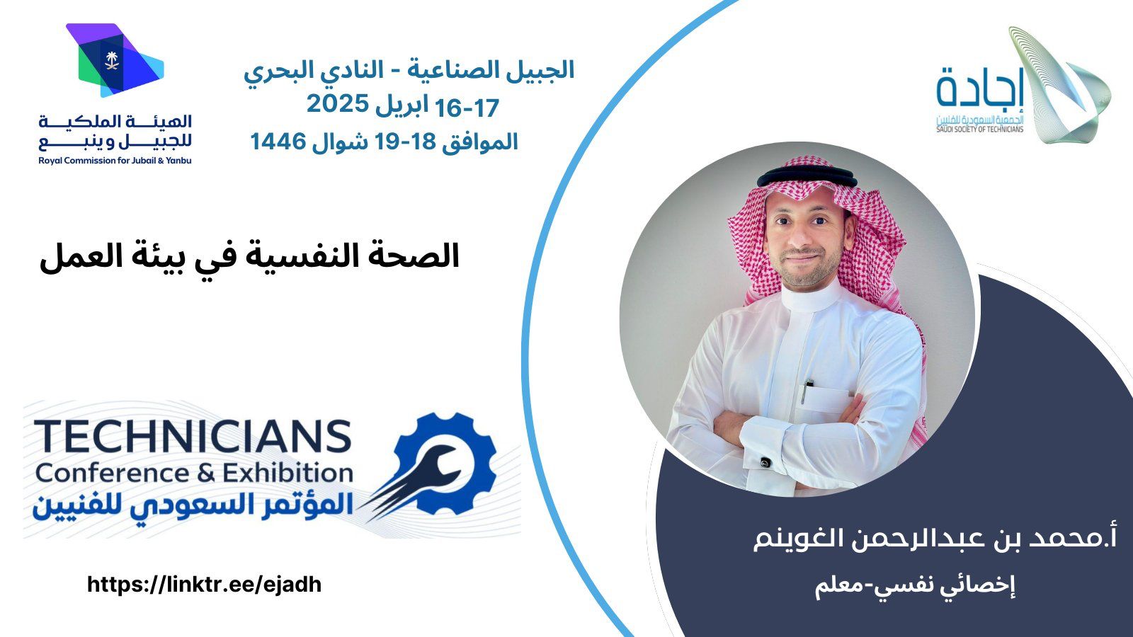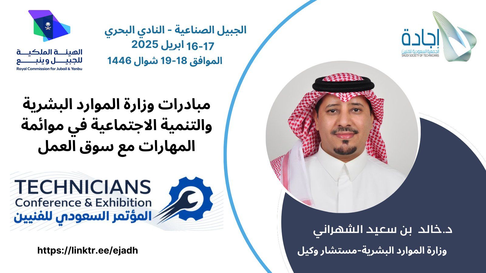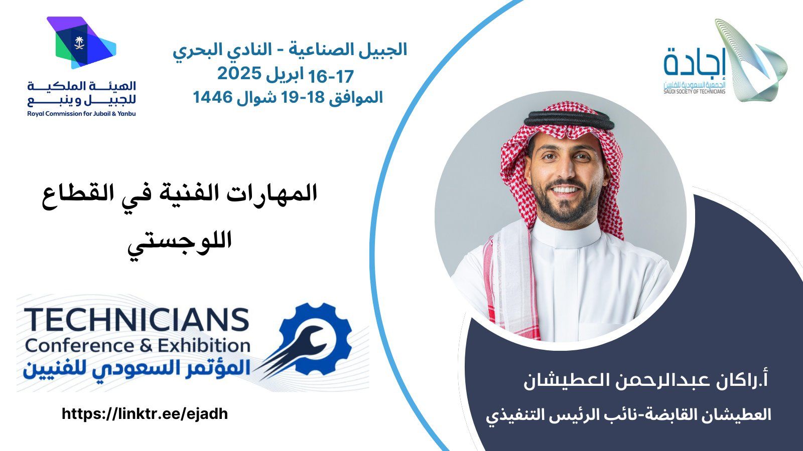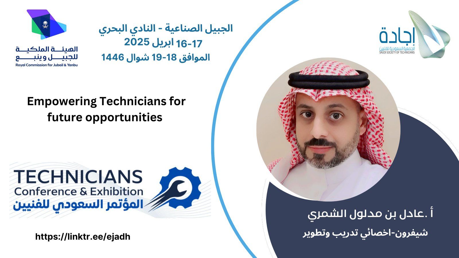 تحت رعاية الرئيس التنفيذي للهيئة الملكية بالجبيل المهندس محمود الذيب تقيم الجمعية السعودية للفنيين #إجادة (المؤتمر السعودي للفنيين) بمدينة #الجبيل_الصناعية يومي الأربعاء والخميس 16 – 17 / 04 / 2025 م بالنادي البحري بدارين الساعة الـ 9 صباحاً.