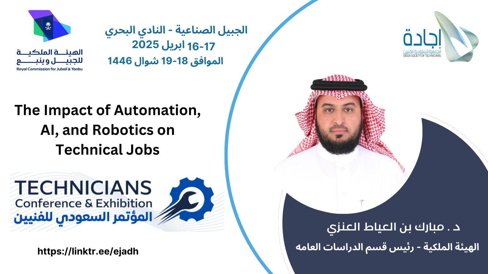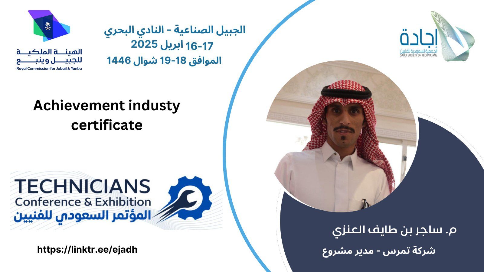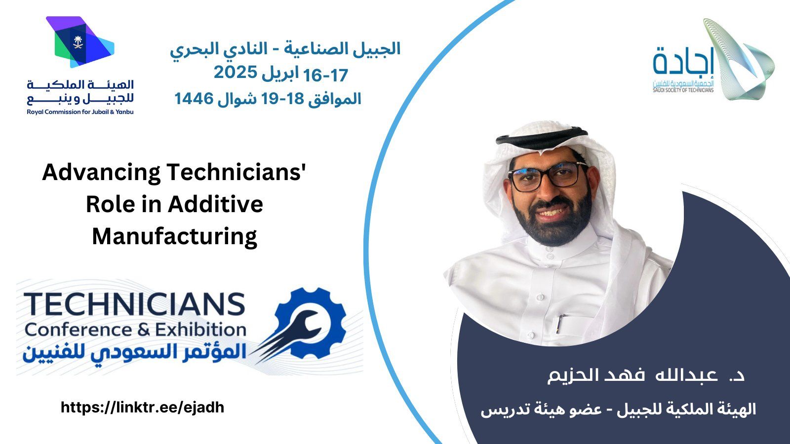 تحت رعاية الرئيس التنفيذي للهيئة الملكية بالجبيل المهندس محمود الذيب تقيم الجمعية السعودية للفنيين #إجادة (المؤتمر السعودي للفنيين) بمدينة #الجبيل_الصناعية يومي الأربعاء والخميس 16 – 17 / 04 / 2025 م بالنادي البحري بدارين الساعة الـ 9 صباحاً.