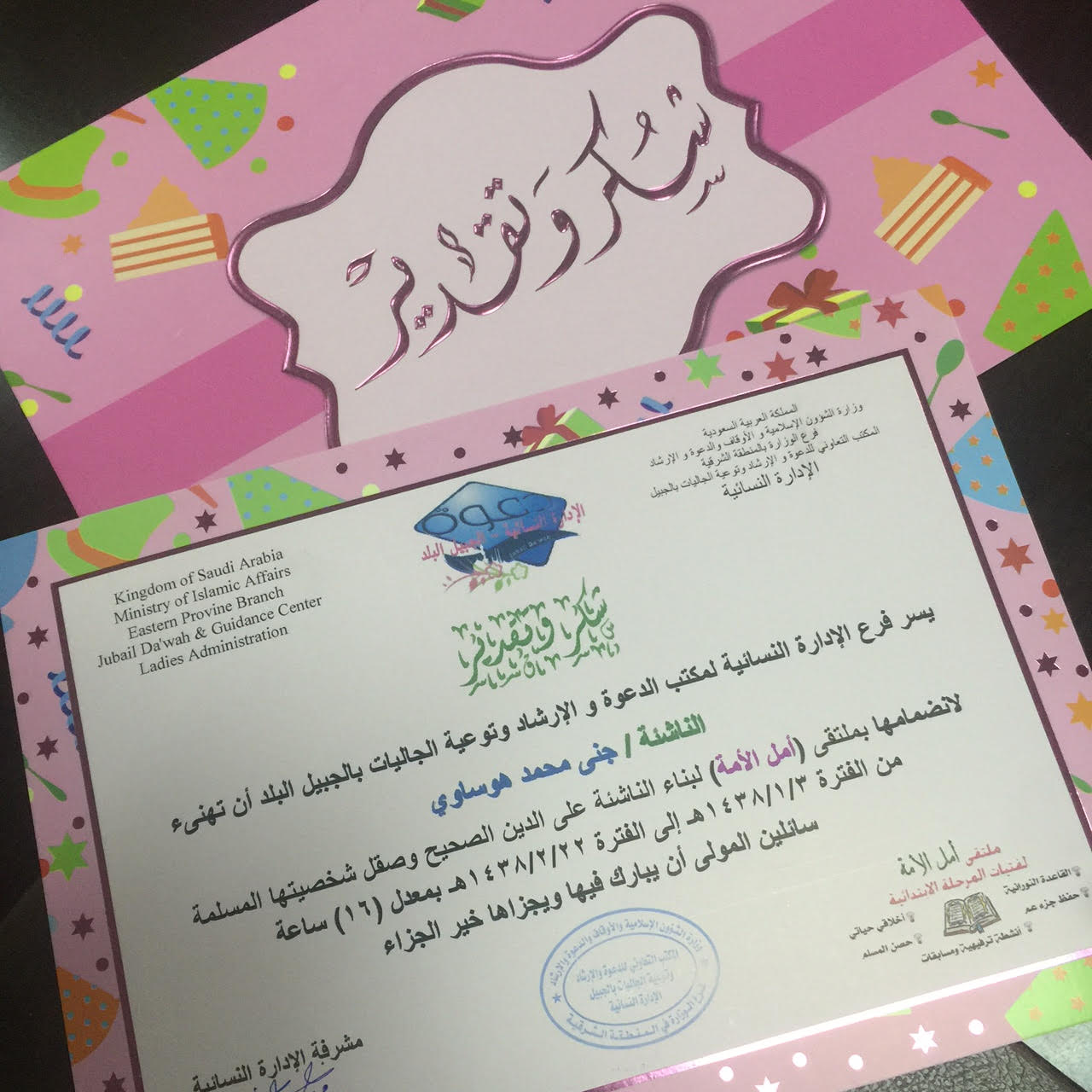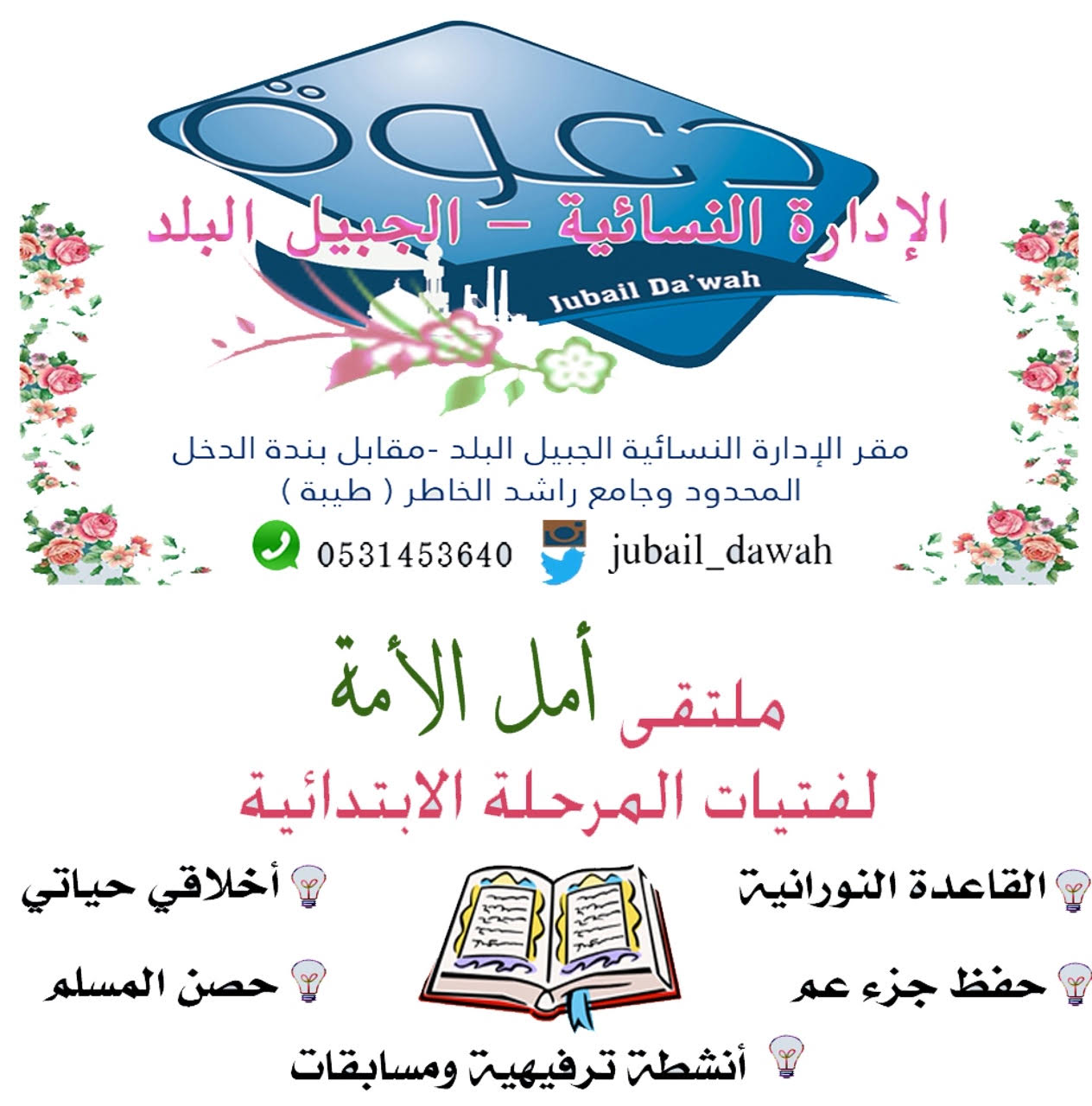 أختتمت الإدارة النسائية في الجبيل البلد للمكتب التعاوني للدعوة والإرشاد وتوعية الجاليات, مساء الأربعاء ملتقى فتيات المرحلة الإبتدائية ( أمل الأمة ) الذي نـظمـه قسم الدعـوة والإرشاد ويهـدف إلى بناء الناشئـة على الديـن الصحيح , وأحتوى الملتقى طوال الثمانية أسابيع على أركان وفعاليات متنوعة كانت محط إهتمام الفتيات المشاركات