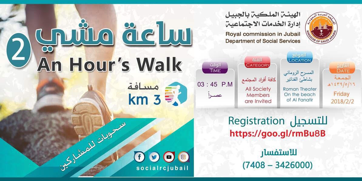 تنظم ادارة الخدمات الاجتماعية بالهيئة الملكية بالجبيل يوم غد الجمعة برنامج الرياضة ” ساعة مشي 2 ” وذلك على طول شاطئ الفناتير بالجبيل الصناعية لمسافة 3 كلم ، وينطلق البرنامج في تمام  الساعة 3:45 عصرا من المسرح الروماني وأعلنت اللجنة المنظمة  أن المشاركة  ستكون من جميع فئات المجتمع .