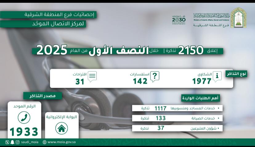 الشؤون الإسلامية بالشرقية تُغلق (2150) طلبًا عبر مركز الاتصال الموحد خلال النصف الأول من عام 2025م