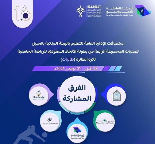 استضافت الهيئة الملكية بالجبيل ممثلة بالإدارة العامة للتعليم، التصفيات المؤهلة للمجموعة الرابعة من بطولة الاتحاد السعودي للرياضة الجامعية لكرة الطائرة (طالبات)، بمشاركة عدد من الجامعات والكليات، وذلك ضمن دعمها المتواصل للأنشطة الرياضية الجامعية وتعزيز حضور الطالبات في المنافسات الوطنية.