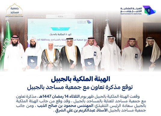 وقّعت الهيئة الملكية بالجبيل أمس، مذكرة تعاون مع جمعية مساجد للعناية بالمساجد بالجبيل؛ بهدف الإسهام في العناية بالمساجد وتقديم الخدمات اللازمة لعمارتها حسيًّا ومعنويًّا في مدينة الجبيل الصناعية.