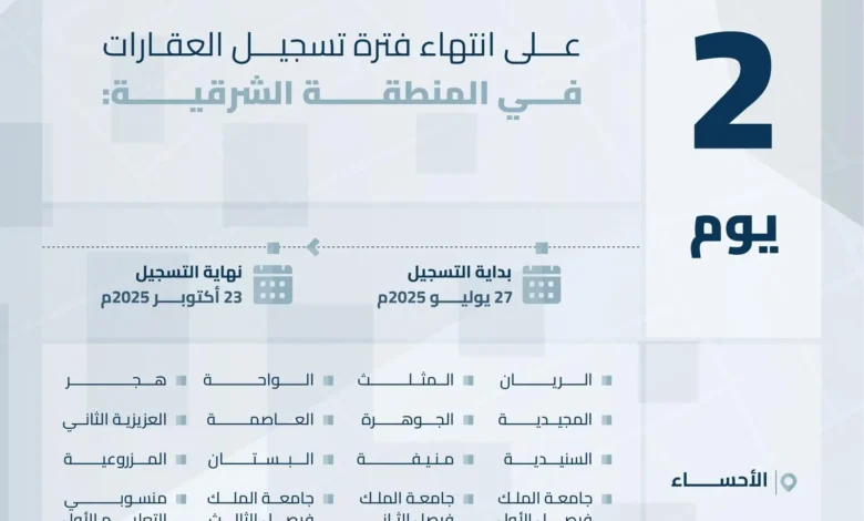 انتهاء مدة تسجيل العقارات في السجل العقاري لـ 20 حيًا في المنطقة الشرقية الخميس القادم
