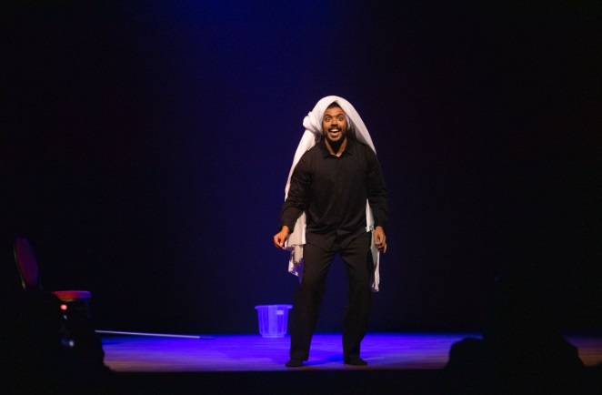 وقد بدأ الافتتاح بالسلام الملكي، ثم عرض مرئي يتناول ممثل واحد يجسد المسرح يعيش الحكاية ويحمل الرسالة كاملة، من اخراج نوح الجمعان وتمثيل شهاب الشهاب، الذي تعامل مع العرض بوصفه تحديًا جميلًا؛ حيث جسد ست شخصيات في جسد “القيادة”، واعتبر الممثل، الذي هو محور العمل وقائد مركزه، مشاركته شرفًا ومسؤولية، وصعد الخشبة ليعيش الانتقال بين ست شخصيات متناقضة، لكل منها صوتها وجسدها وحالتها الخاصة.