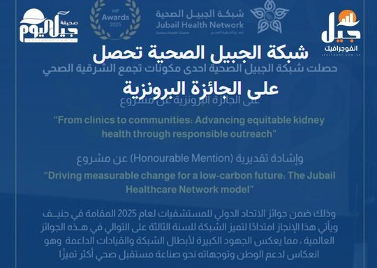 #انفوجرافيك_جيل | إنجاز جديد في #الجبيل .. شبكة #الجبيل الصحية تحصل على الجائزة البرونزية وإشادة تقديرية