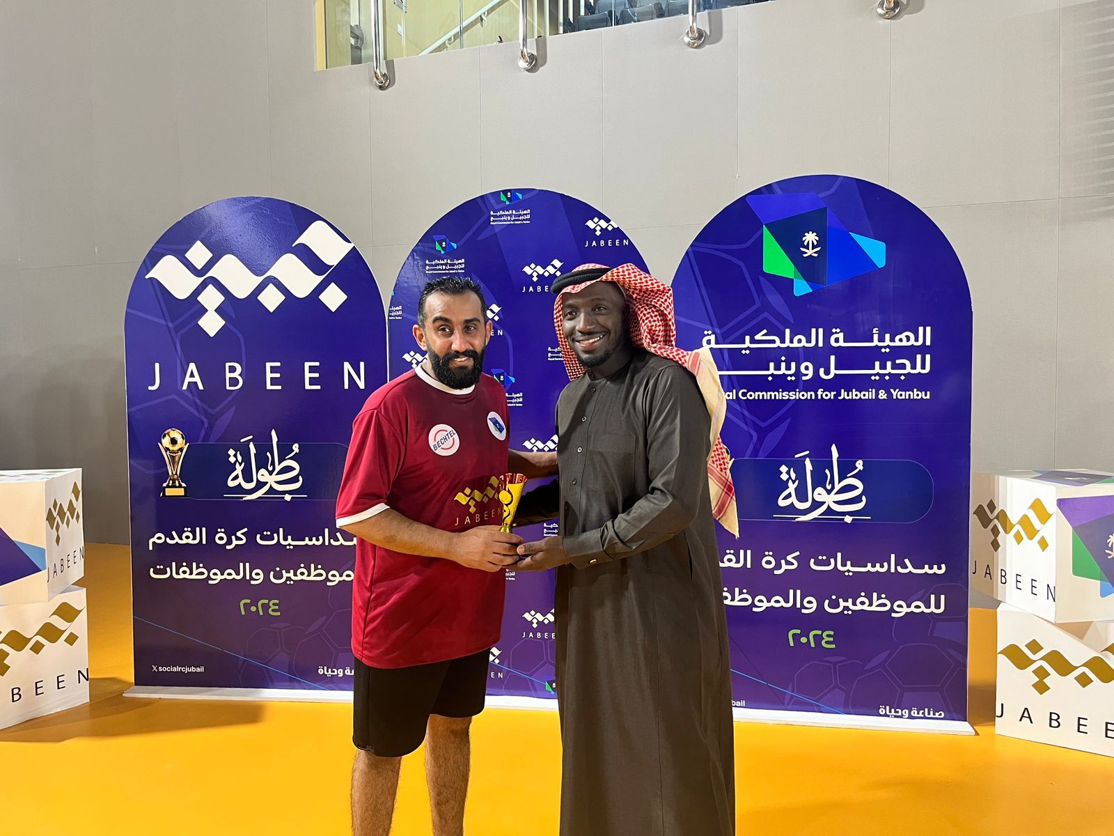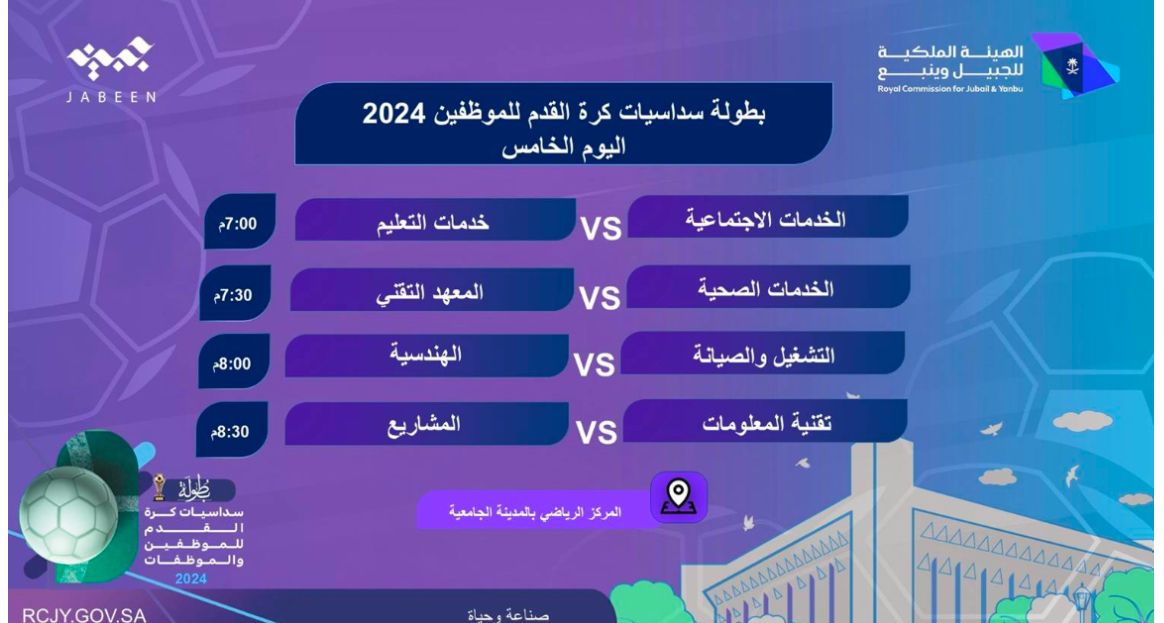 تأهل فريق الخدمات الاجتماعية إلى الأدوار الإقصائية من بطولة سداسيات كرة القدم للموظفين التي تنظمها إدارة الخدمات الاجتماعية بالهيئة الملكية بالجبيل برعاية من «شركة جبين» بالمركز الرياضي بالمدينة الجامعية بمدينة الجبيل الصناعية بعد تغلبه على فريق خدمات التعليم بخماسية نظيفة.
