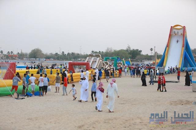 كما حرصت اللجنة المنظمة على توزيع عدد من المنقذين في مواقع مختلف على امتداد الشاطئ من اجل المراقبة والتدخل السريع في حال وجود حالات غرق لا سمح الله خاصة وهي خطوة لقين اشادة عدد من زوار المهرجان.وقد أكد المشرف العام على المهرجان عبدالله المحمدي أن الفعاليات شهدت مشاركة العديد من هواة الرياضات البحرية كما كان الحضور ممتاز من قبل الزوار من الجبيل الصناعية والمحافظات القريبة خاصة ان انطلاق الفعاليات صادف العطلة الأسبوعية وقدر عدد الزوار للأيام الاربع الاولى نحو 15 الف زائر.وأجمع زوار المهرجان على إيجابية فكرة المهرجان مؤكدين أن ذلك يعطي الفرصة لا صحاب الهوايات ممارستها بالشكل الذي يتناسب مع ميولهم حيث ان المعروف ان التركيز لدى الكثير على كرة القدم ولكن المهرجان يعطي الفرصة للتنوع في ممارسة الرياضة خاصة وان هناك من يمارسها بشكل شخصي على الشواطئ.وكانت بداية المهرجان قد شهدت مسيرة بحرية مكونة المكونة من الدبابات البحرية، وقوارب التجديف، والشراع في منظر جميل ورائع حاز على إعجاب الحضور وشهدت فعاليات الاطفال أقبال كبير من الاسر الذين حرصوا على مشاركة أطفالهم الاستمتاع بالألعاب الموجودة مثل الملعب الصابوني والرسم والتشكيل  بالرمال.في الوقت الذي حصر أولياء الامور على التقاط الصور التذكارية للأطفال وهم يمارسون العابهم على الشاطئ.