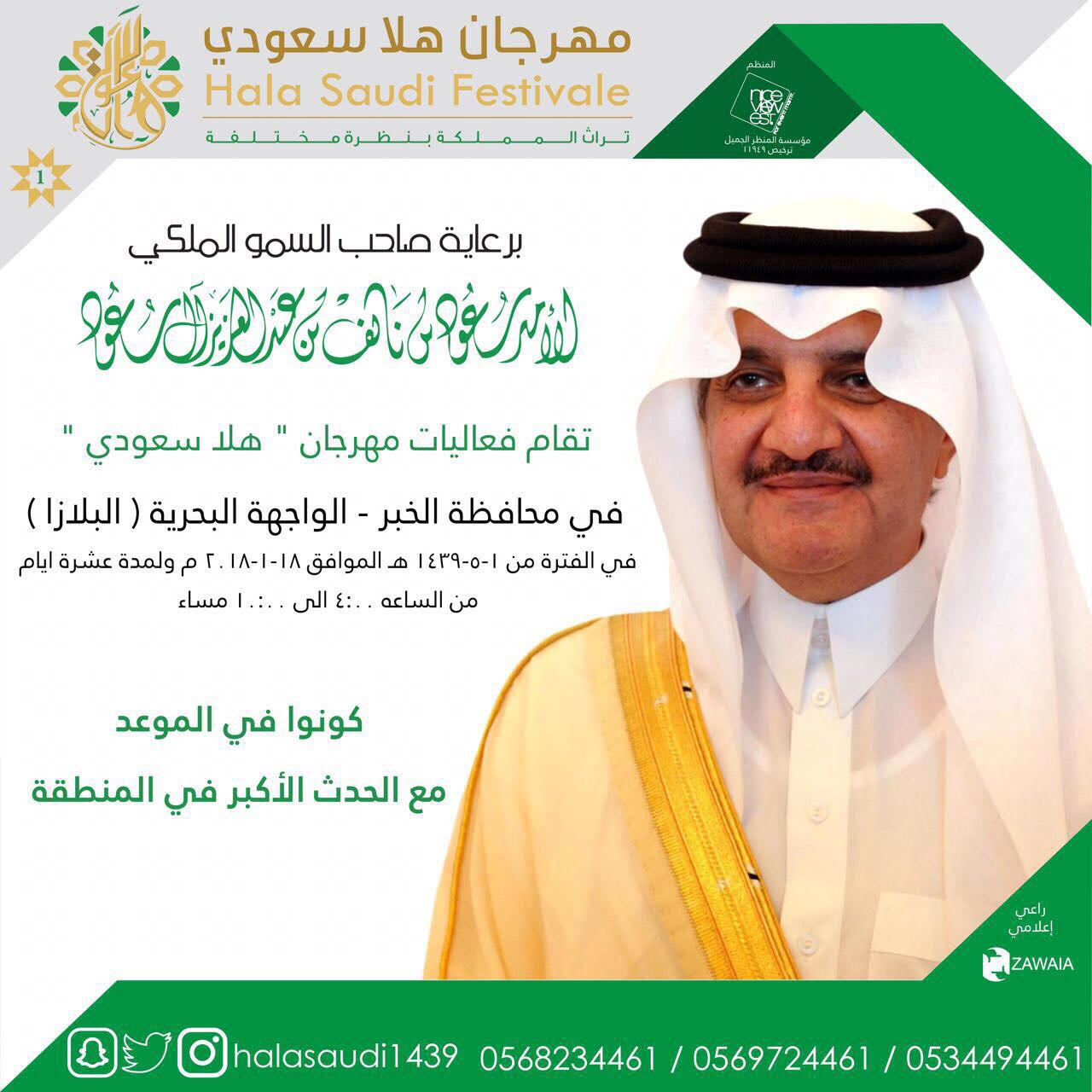 انهت اللجنة المنظمه لمهرجان “هلا سعودي” والذي سيقام على الواجهة البحرية بمدينة الخبر ، برعاية صاحب السمو الملكي الأمير سعود بن نايف بن عبدالعزيز أمير المنطقة الشرقية، في 1 جمادى الأولى 1439هـ الموافق 18 يناير 2018 ويستمر مدة عشرة أيام، تحضيراتها الأولية