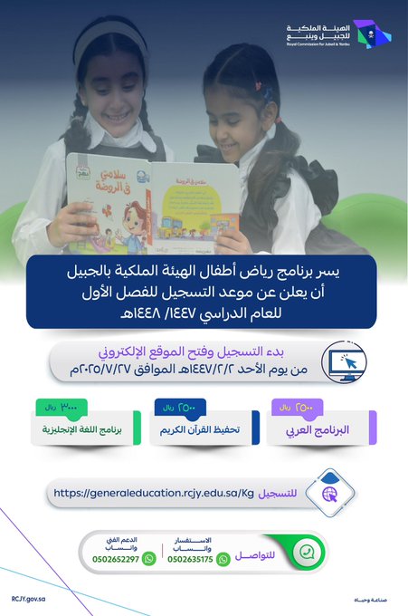 أعلن برنامج رياض أطفال #الهيئة_الملكية_بالجبيل عن موعد التسجيل للفصل الأول من العام الدراسي 1447/ 1448هـ.