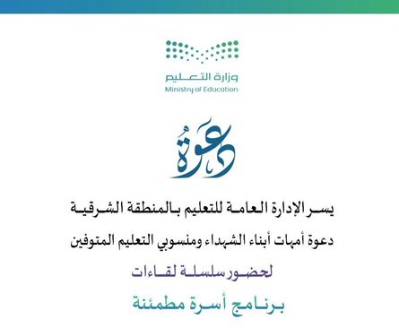 ينفّذ تعليم الشرقية سلسلة من لقاءات برنامج "أسرة مطمئنة"، الذي يستهدف أمهات أبناء الشهداء ومنسوبي التعليم المتوفين.