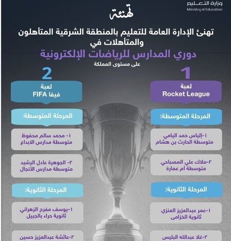 هنأت الإدارة العامة للتعليم بالمنطقة الشرقية الطلبة المتأهلين لنهائيات المملكة في دوري المدارس للرياضات الإلكترونية في منافسات (FIFA) و (Rocket League).