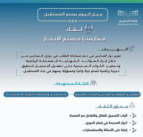 يُنفذ تعليم الشرقية اليوم الإثنين لقاء “مدارسنا مصنع الإنجاز” لتعزيز مشاركة الطلاب في دوري المدارس، من خلال إبراز الفوائد المهارية للمشاركة الرياضية، وتحفيز الكوادر المدرسية على تفعيل التسجيل لصناعة جيل واعٍ ومسؤول.