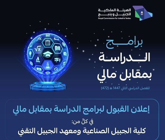 تعليم “ملكية الجبيل” يعلن عن برامج الدراسة بمقابل مالي في كلية الجبيل الصناعية ومعهد الجبيل التقني