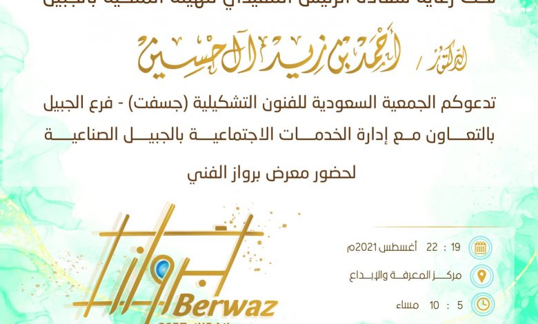 تطلق الجمعية السعودية للفنون التشكيلية (جسفت) – فرع الجبيل، بالتعاون مع إدارة الخدمات الإجتماعية بالجبيل الصناعية، معرض برواز الفني، تحت رعاية سعادة الرئيس التنفيذي للهيئة الملكية بالجبيل الدكتور أحمد بن زيد آل حسين، وذلك في الفترة: 19 إلى 22 أغسطس 2021م، بمركز المعرفة والإبداع بمدينة الجبيل الصناعية.