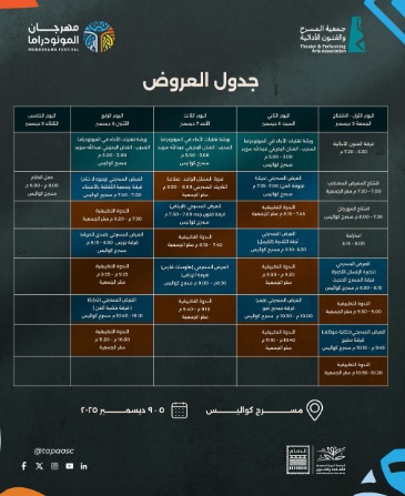 ينطلق غداً الجمعة ٥ ديسمبر ٢٠٢٥ م ، مهرجان المونودراما بالدمام، من تنظيم جمعية المسرح والفنون الأدائية، وتنفيذ جمعية الثقافة والفنون بالدمام، وهو حدث مسرحي وطني نوعي، يهدف المهرجان إلى إبراز دور الجمعية في دعم الحراك المسرحي في المملكة والتعريف بفن المونودراما كشكل إبداعي يركز على الأداء الفردي العميق.