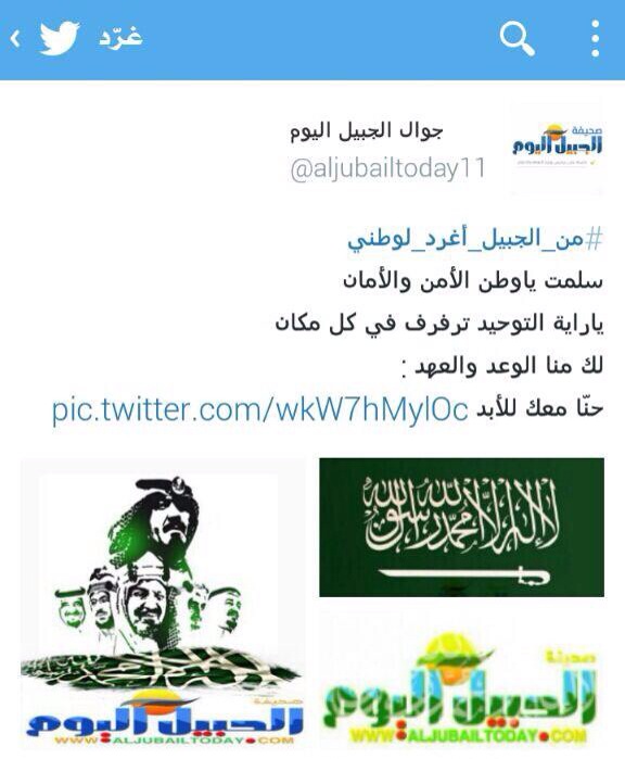 استمرارا للتميز الذي تقدمه صحيفة ” الجبيل اليوم ” فقد حقق حساب جوال الصحيفة عبر تويتر ” aljubailtoday11@ المركز الثالث في مسابقة التغريد عبر وسم #من_الجبيل_أغرد_لوطني . وهي المسابقة التي أعلنتها الهيئة الملكية بالجبيل احتفالا باليوم الوطني الرابع والثمانين للمملكة العربية السعودية .