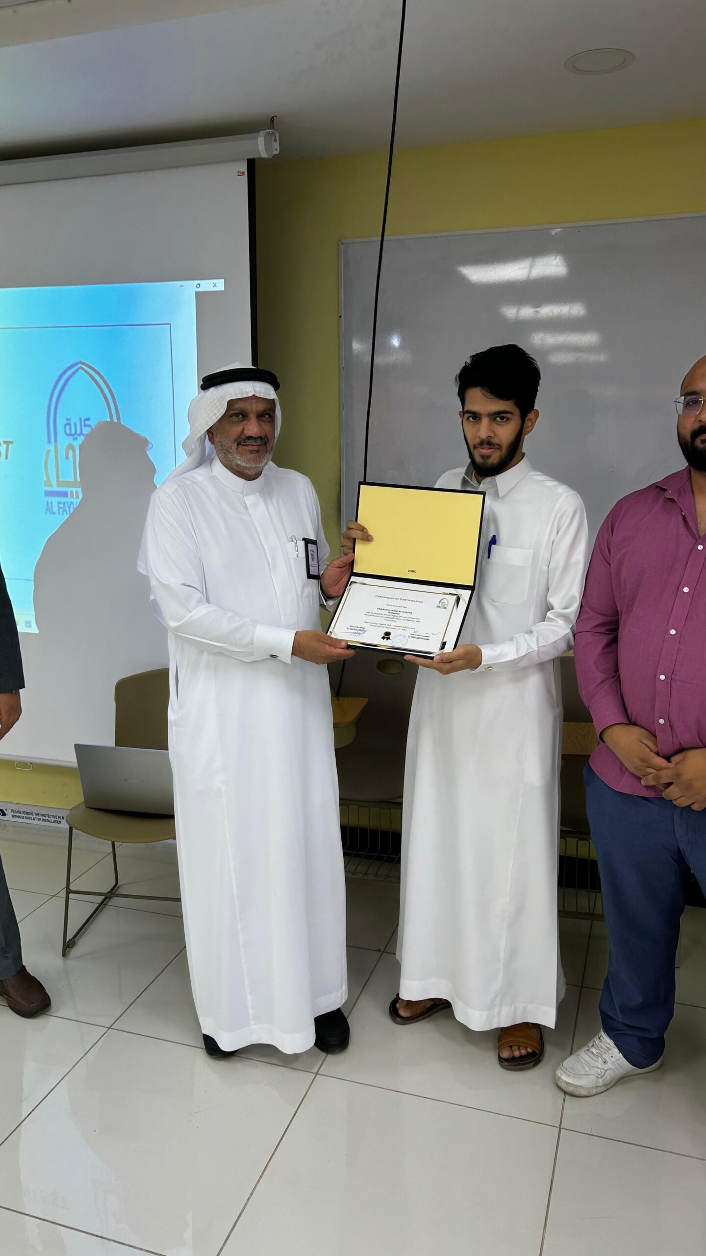 بتنظيم وحدة شؤون الطلاب مع نادي اللغة الإنجليزية بكلية الفيحاء الأهلية بالجبيل اختُتمت فعاليات مسابقة الخطابة لنادي اللغة الإنجليزية في شطر الطلاب ، بحضور سعادة عميد الكلية الدكتور طلال بن حمزه مغربي، وعدد من أعضاء هيئة التدريس والطلاب.