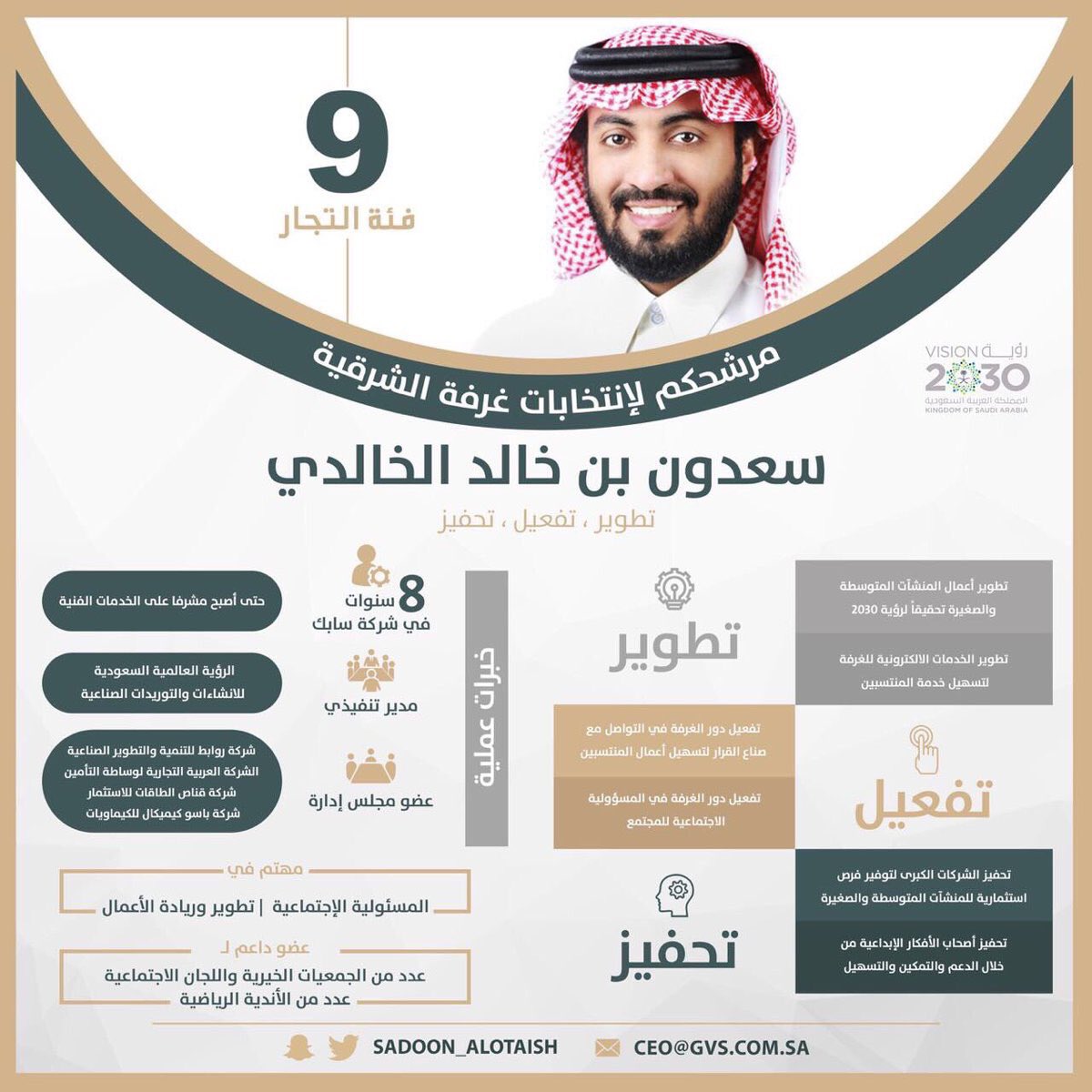 وطننا يستحق.. وخدمته واجبه علينا .. بهذه الجملة بدأ مرشح انتخابات غرفة الشرقية رجل الأعمال سعدون بن خالد الخالدي ( فئة التجار 9 ) حديثه الإعلاني في حملته الانتخابية لعضوية مجلس إدارة غرفة الشرقية التي تنطلق بعد غد الاحد .. وقال الخالدي ” يجب أن تكون أفعالنا تسبق أقوالنا ” وأضاف ” أسعى من خلال ترشحنا لعضوية مجلس ادارة غرفة الشرقية أن نكون أكثر فاعلية ودعما لأصحاب المشاريع سواء الصغيرة أو المتوسطة أو الكبيرة لإيصالهم لتحقيق طموحاتهم وأهدافهم ” وأضاف الخالدي ” لست أفضل المرشحين ولكن بفضل الله ثم بتوجيهاتكم ونصحكم وارشاداتكم واقتراحاتكم سوف أكون كذلك بإذن الله تعالى ” .