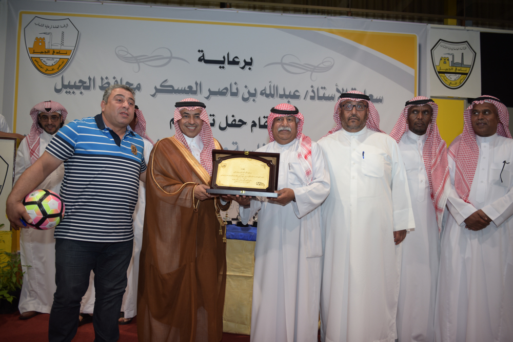 رعى محافظ الجبيل الاستاذ عبدالله العسكر مساء الأربعاء حفل تكريم الفريق الاول لكرة القدم بنادي الجبيل بمناسبة صعوده لمصاف أندية الدرجة الثانية وكذلك صعود فريق كرة السلة للناشئين لمصاف أندية الدرجة الممتازة واللاعبين الذين حققوا ميداليات ذهبية وفضية عالمية من فرق الكاراتيه والتايكوندو، بحضور عدد من رجال الاعمال ورؤساء الشركات وأهالي الجبيل.