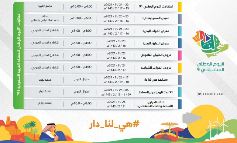 حيث أكلمت الهيئة الملكية بالجبيل استعداداتها وترتيباتها اللازمة للاحتفال باليوم الوطني(91) على مدار أربعة أيام وذلك ابتداء  من يوم الأربعاء 15/2/1443 هـ. حيث أعلنت الهيئة الملكية بالجبيل عن عدد من الفعاليات التي تحتوي على عدد من البرامج الاحتفالية المتنوعة.