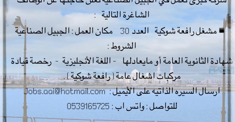 شركة كبرى بـ #الجبيل_الصناعية بحاجة لموظفين سعوديين .. تعرف عليها