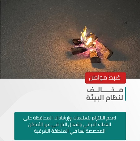 ضبطت القوات الخاصة للأمن البيئي مواطنًا مخالفًا لنظام البيئة؛ لعدم الالتزام بتعليمات وإرشادات المحافظة على الغطاء النباتي بإشعال النار في غير الأماكن المخصصة لها في المنطقة الشرقية، وطبقت الإجراءات النظامية بحقه، مؤكدةً أن عقوبة إشعال النار في غير الأماكن المخصصة لها في الغابات والمتنزهات الوطنية غرامة تصل إلى (3,000) ريال.