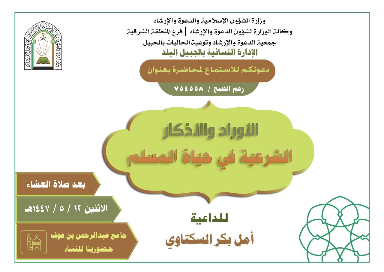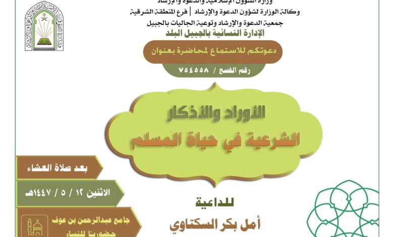 يُنفذ فرع وزارة الشؤون الإسلامية والدعوة والإرشاد بالمنطقة الشرقية، ممثلاً بإدارة المساجد والدعوة والإرشاد، وبالتعاون مع جمعيات الدعوة والإرشاد وتوعية الجاليات بمحافظات الأحساء ورأس تنورة والجبيل، اليوم الاثنين الثاني عشر من شهر جمادى الأولى 1447هـ، سلسلة من المحاضرات النسائية تُلقيها مجموعة من الداعيات.