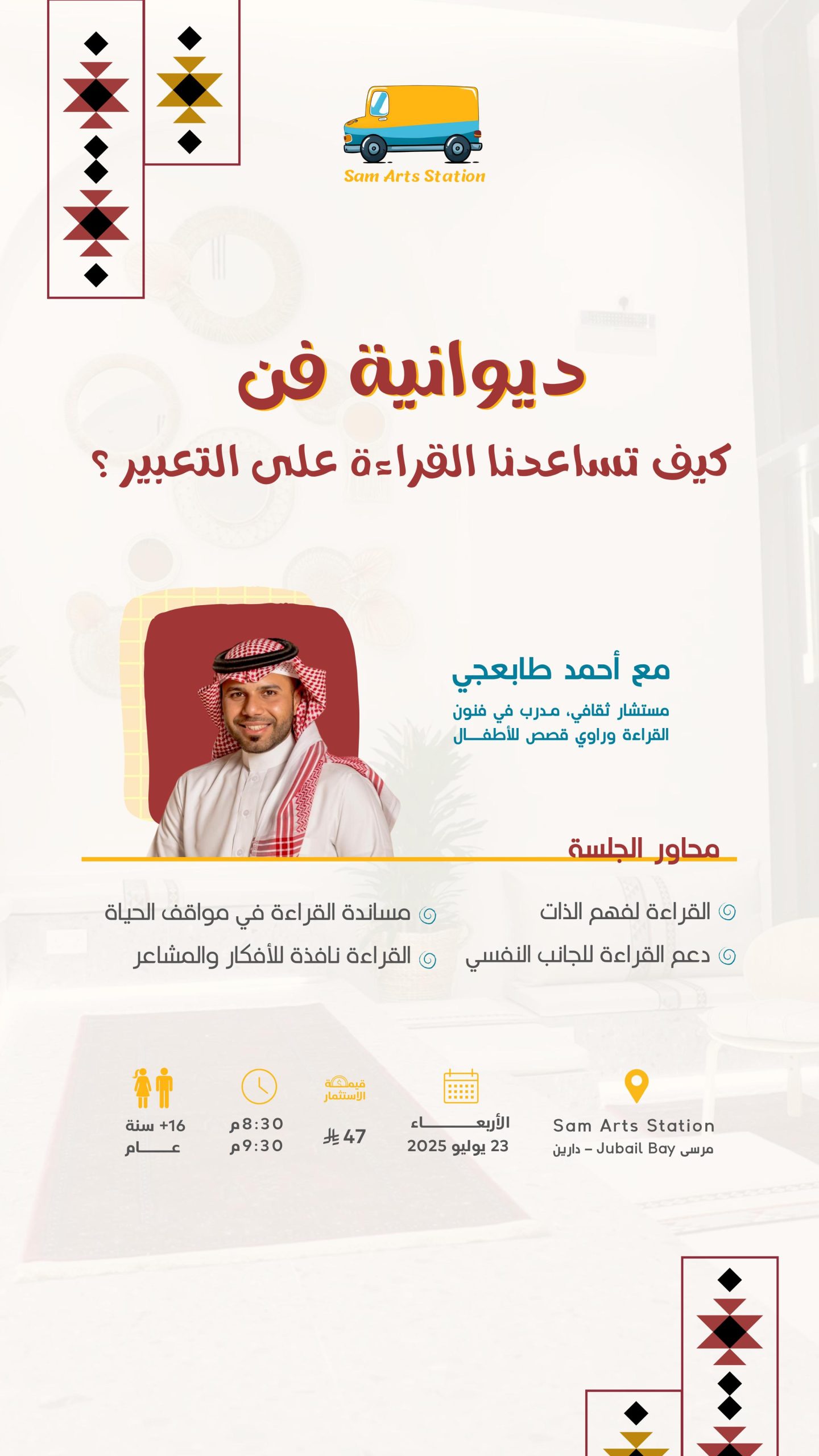 استضافت ديوانية فن بـ “Sam Arts Station” المستشار الثقافي أحمد طابعجي في لقاء تحدث فيه عن “كيف تساعدنا القراءة على التعبير”.
