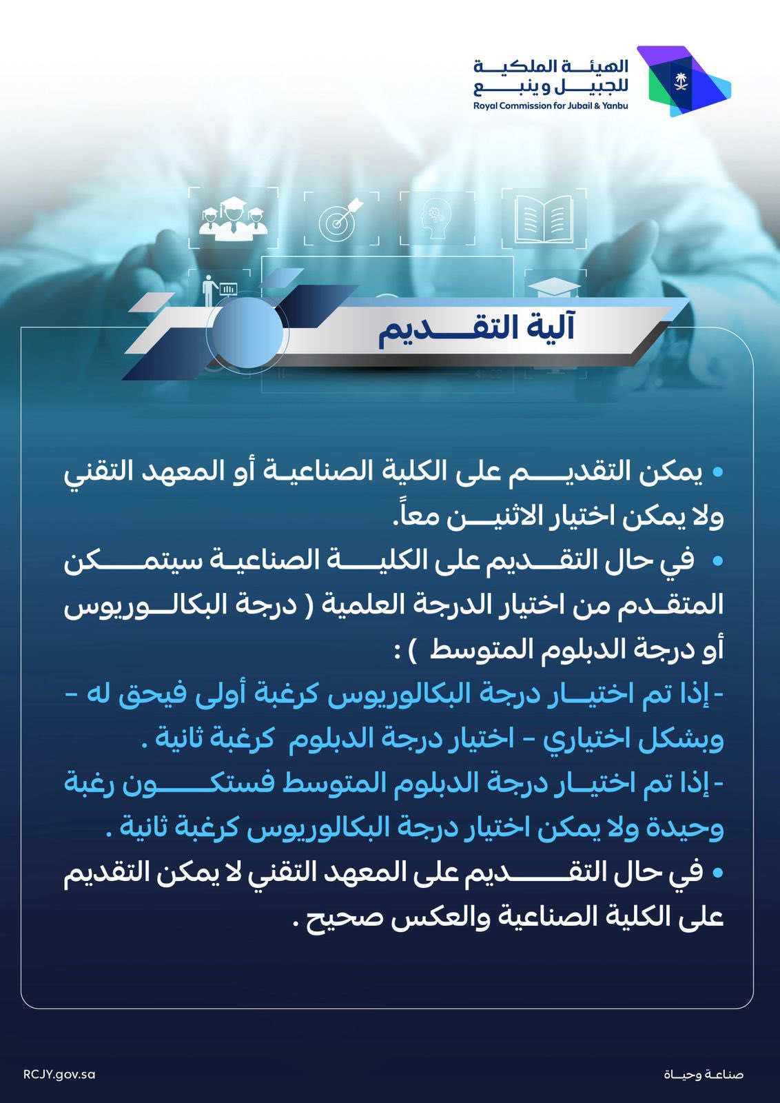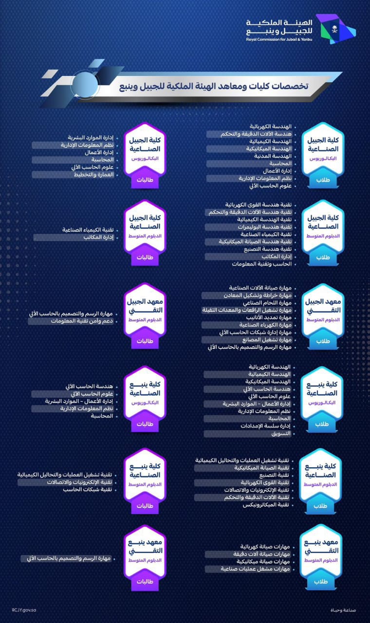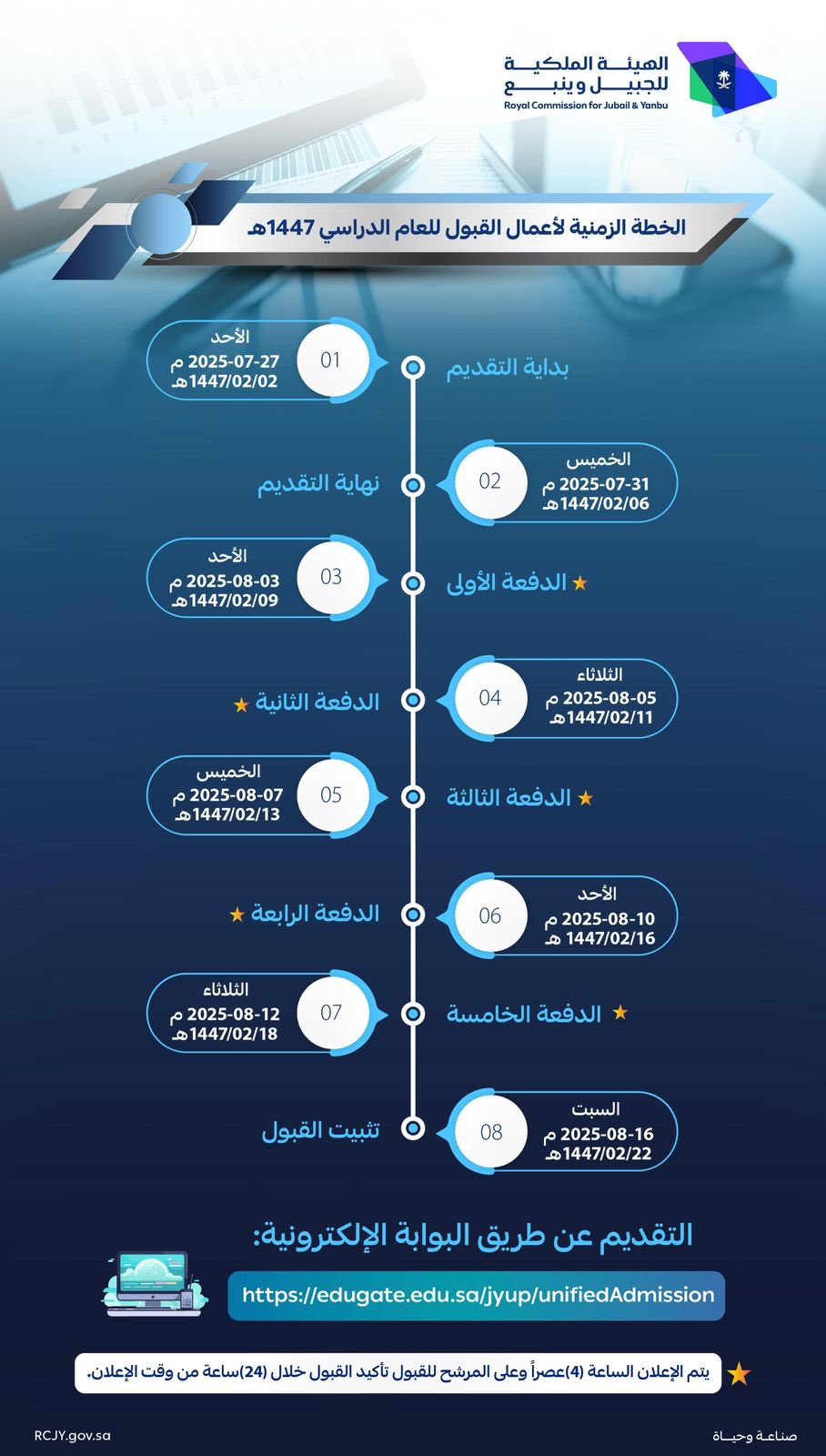 كليات ومعاهد الهيئة الملكية للجبيل وينبع تعلن عن الخطة الزمنية لأعمال القبول للعام الدراسي 1447هـ