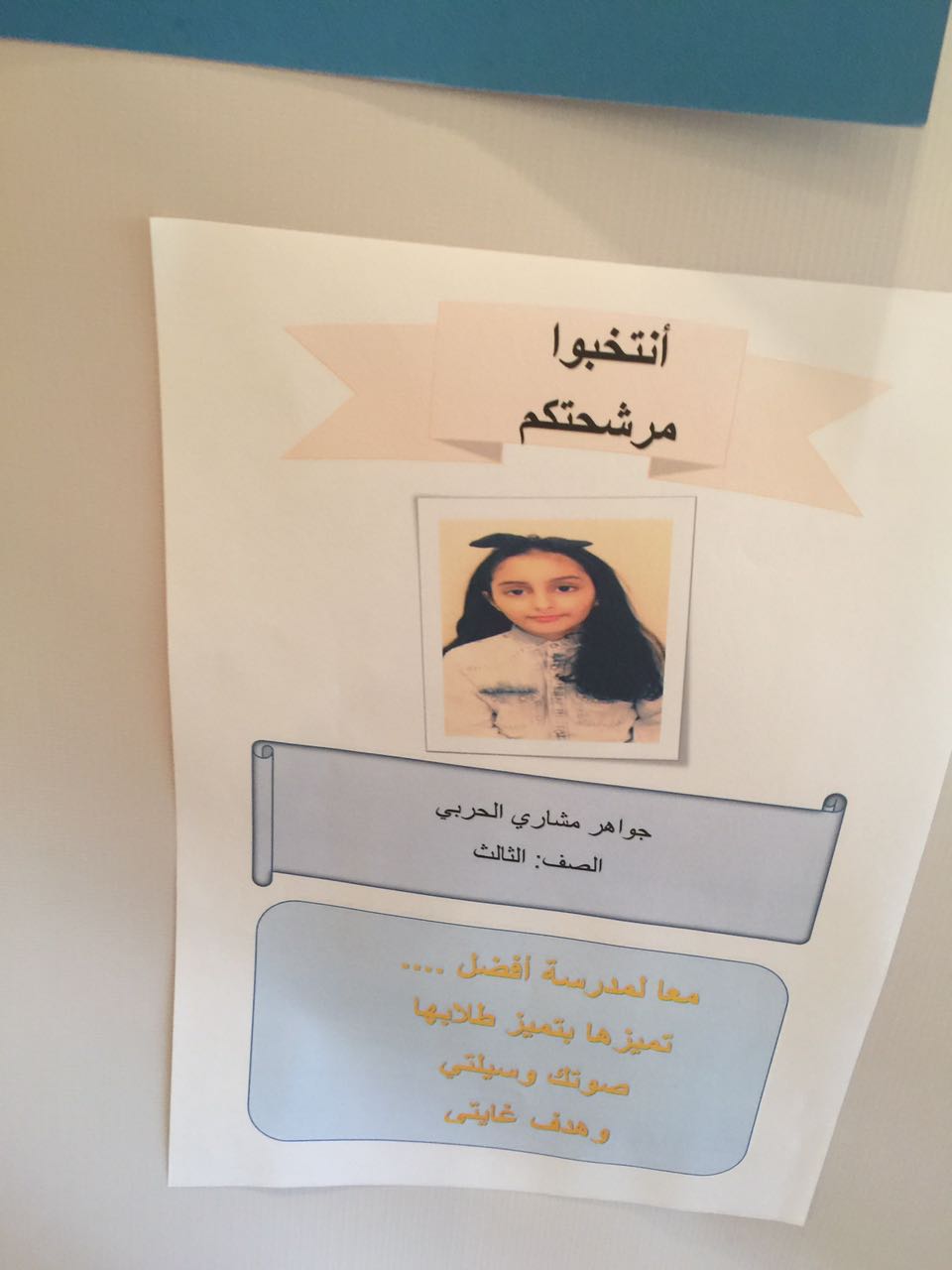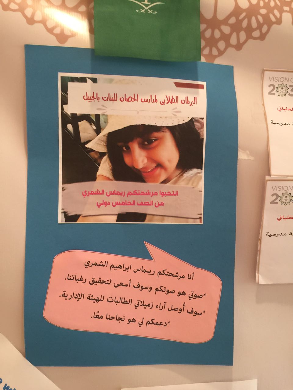 جواهر الحربي رئيسة للبرلمان جود السبيعي نائبة الرئيسة وجوان القطان أمينة السر وذلك للمرحلة الإبتدائية ، وللمرحلة المتوسطة والثانوية فازت كل من لمياء العلياني رئيسة البرلمان وشادن الحربي نائبة الرئيسة وسارة عبدالقادر أمينة السر