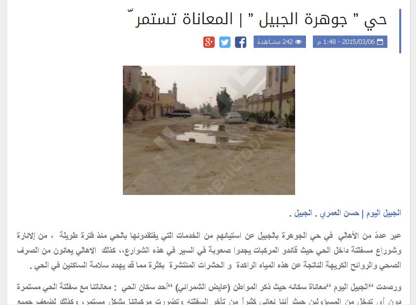 وكان مدير عام المياه بالشرقية المكلف م حمد الوابل عقّب في خطاب رسمي لرئيس التحرير بالصحيفة على خبر صحيفة ” الجبيل اليوم ” الإلكترونية الذي جاء بعنوان ” حي جوهرة الجبيل .. المعاناة تستمر(http://aljubailtoday.com.sa/2015/03/06/68097.html ) ” بقوله :