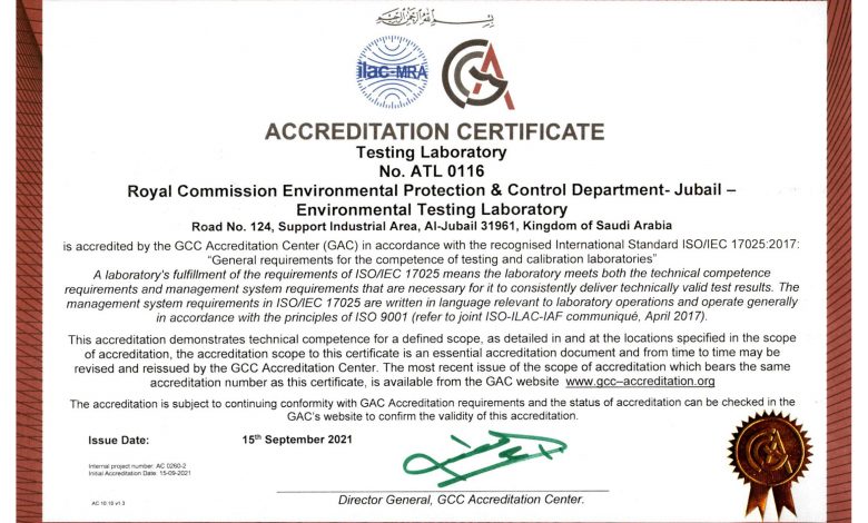 مركز الاعتماد الخليجي يمنح الهيئة الملكية بالجبيل شهادة الأيزو لكفاءة مختبرات الفحص