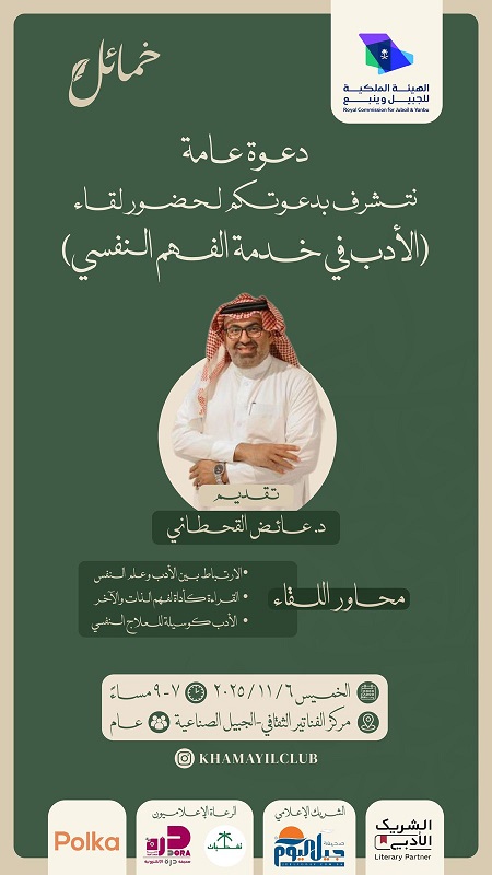 ويستضيف مركز الفناتير الثقافي بالجبيل الصناعية يوم الخميس 6 – 11 – 2025 لقاء ” الأدب في خدمة الفهم النفسي” للدكتور عائض فهد القحطاني.