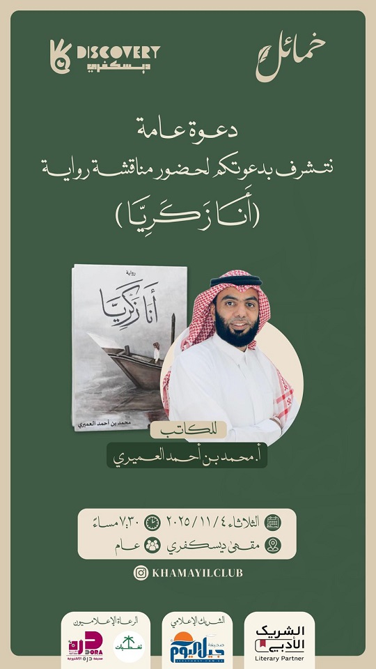 يستضيف نادي خمائل الثقافي الكاتب محمد العميري يوم الثلاثاء 4 – 11 – 2025 لمناقشة رواية ( أنا زكريا) مع الجمهور بمقهى ديسكفري بالجبيل الصناعية والرواية الجديدة ( أنا زكريا) وهي فانتازيا تاريخية تدون لمرحلة مهمة في المنطقة الشرقية وهي مرحلة توقف استخراج اللؤلؤ حاولت في الرواية تسجيل الكثير من المصطلحات البحرية التي كان يستخدمها أهل البحر ولا تخلو الرواية من أيام مرعبة وتقلبات نفسية واجتماعية مر فيها الفتى زكريا.