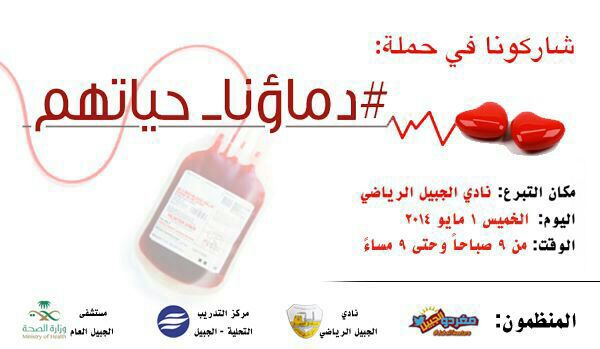 تحت رعاية محافظ الجبيل المهندس بدر العطيشان تنطلق يوم الخميس المقبل حملة للتبرع بالدم ينظمها مستشفى الجبيل العام بالتعاون مع مبادرة مغردو الجبيل التطوعية تحت شعار ” دماؤنا حياتهم ” وذلك بمقر نادي الجبيل الرياضي .