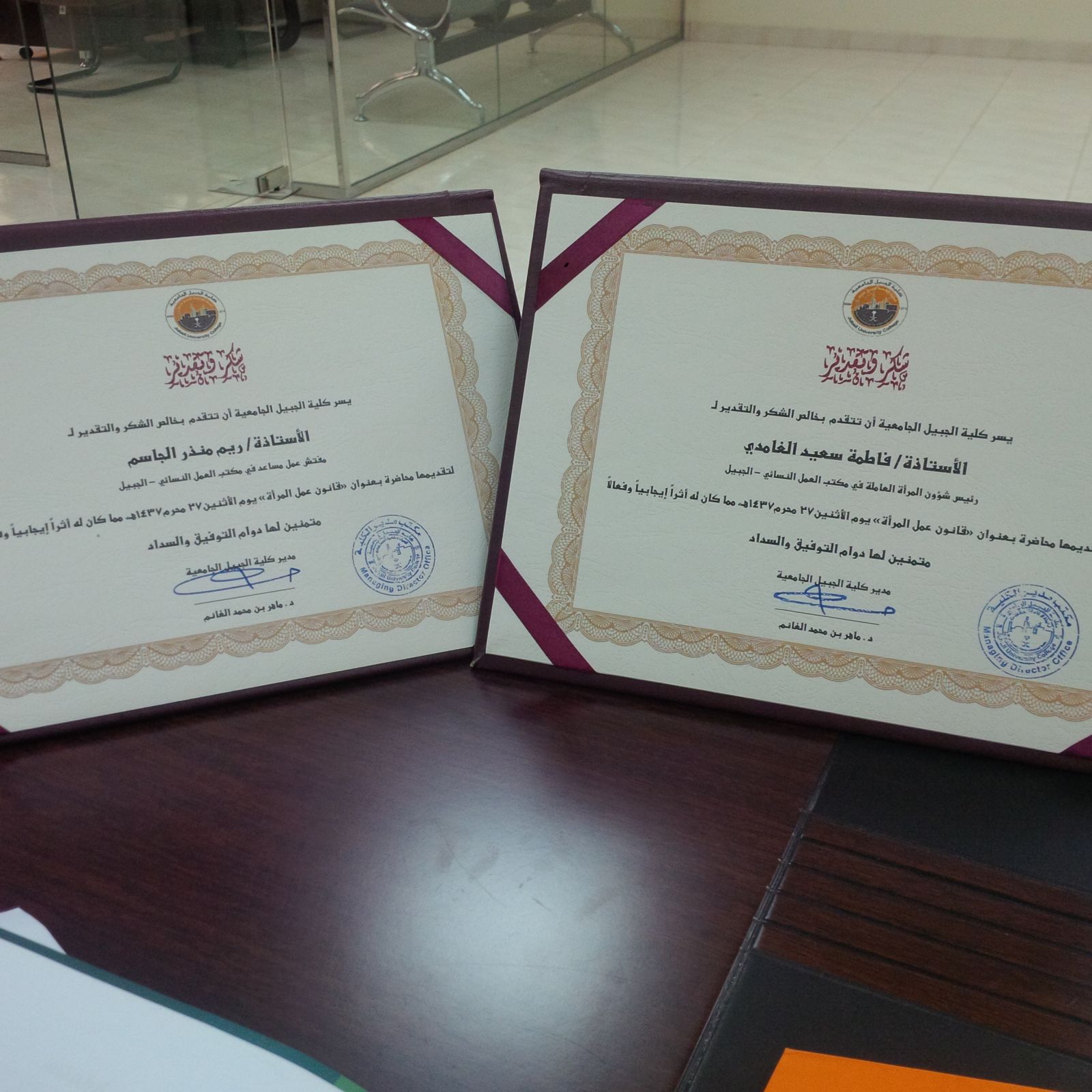 نفذ القسم النسائي بمكتب العمل بمحافظة الجبيل ورشة عمل بعنوان ” قانون عمل المرأة ” امتدت لثلاث ساعات متواصلة ,, حيث اقيمت في مقر الكلية الجامعية للبنات واستهدفت شريحة من الطالبات المقبلات على التخرج ,, القت الورشة مديرة المكتب الأستاذة / فاطمة الغامدي والاستاذة / ريم الجاسم  ، هذا وقد تم تسليط الضوء على قوانين عمل المرأة في القطاع الخاص وتقديم الشرح المفصل لعقود العمل وشروطها وكل ما يترتب للموظفة من حقوق وما عليها من التزامات , وما ينبغي ان تتضمنه بيئة العمل كي تكون آمنه وتحقق الاستقرار الوظيفي لها اثناء تأدية عملها ,وذلك بهدف زيادة الوعي القانوني في هذا المجال ..وفي نهاية الورشة تم الاجابة على جميع استفسارات الطالبات وتساؤلاتهن التي تصب في اطار نظام العمل .. وختاما تم تكريم ” الغامدي ” و ” الجاسم ” نظير جهودهما بشهادات شكر وتقدير ,, كما تم توزيع استبيانات لقياس رضا الحاضرات عن مستوى الورشة ليكون ذلك دافعا للمكتب للاستمرارية في اقامة ورش العمل التي تزيد من الوعي بانظمة العمل ..