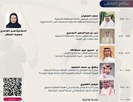 ويستضيف الملتقى عدد من القيادات ومسؤولي العلاقات المؤسسية بالمنطقة الشرقية لاستعراض تجاربهم في التعامل مع جائحة كورونا حيث يشارك الاستاذ محمد الصفيان المتحدث الرسمي بأمانة المنطقة الشرقية تجربتها الاعلامية خلال الجائحة، كما يشارك الاستاذ ذيب الدوسري مدير عام شؤون سابك بالمنطقة الشرقية بورقة عمل بعنوان معاً نتغلب على كورونا، ويقدم م. حسين حنبظاظه مدير مركز الملك عبدالعزيز الثقافي-إثراء- ورقة عمل بعنوان تجربة ثقافية وليدة الجائحة، ويستعرض الأستاذ مطلق الجلعود مدير إدارة التواصل والعلاقات العامة بصحة الشرقية أهمية العلاقات العامة والتوعية اثناء جائحة كورونا، ويناقش الاستاذ فيصل الظفيري مدير إدارة الاتصال والاعلام بالهيئة الملكية بالجبيل بورقة بعنوان تكامل الادوار الإعلامية بمدينة الجبيل الصناعية. وسوف يدير محاور الملتقى الإعلامية هدى الغامدي.