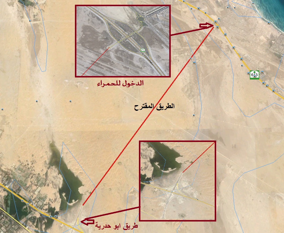 أما كيفية ربطها بالجبيل فأقترح أن تخدم عن طريق انشاء خط يبدأ من الجسر الواقع على طريق الجبيل الدمام السريع للدخول لحي الحمراء ومنه الى طريق ابو حدرية بطول حوالي 16 كم والذي سيخدم منطقة التشاليح ويربط طريق الجبيل الدمام السريع بطريق ابو حدرية ومنه الى طريق الرياض الدمام السريع. كما سيفيد هذا الطريق في التخفيف من الضغط على طريقي الجبيل الدمام وطريق أبو حدرية. حيث سيسلكه الكثير من المسافرين من والى مدينة الرياض.