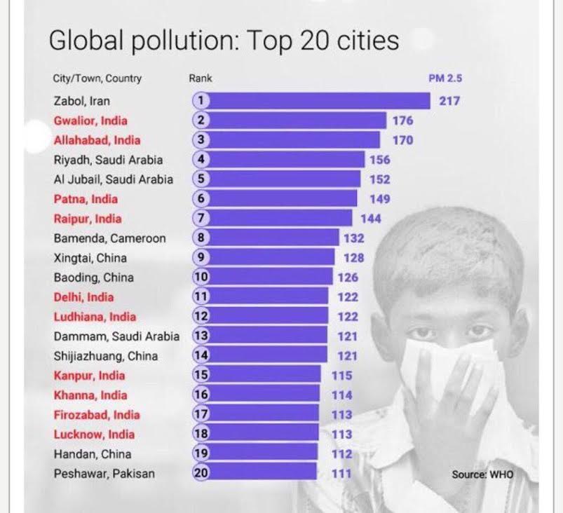 بينما قالت #صحيفة #صدى الالكترونية :أنه صنفت ثلاث مدن سعودية ضمن قائمة المدن العشرين الأعلى تلوثاً في العالم وفقا لتقرير أصدرته حديثا منظمة الصحة العالمية.وجاءت مدينة الرياض في المرتبة الثامنة عالمياً، فيما حلت مدينتي الجبيل والدمام في المرتبة الخامسة عشر، فيما تصدرت مدينة أونيتشا النيجيرية القائمة، ثم مدينة بيشاور الباكستانية ثانياً، ثم مدينة زعبول الإيرانية ثالثاً كأكثر مدن العالم تلوثاً.
